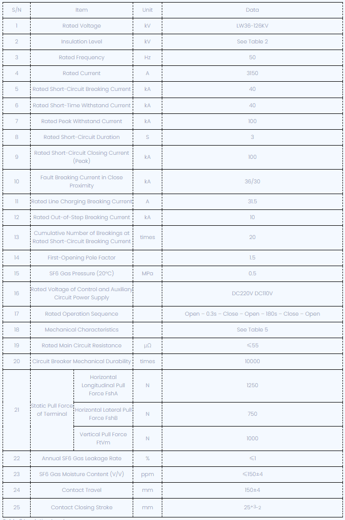 Технічні параметри вимикача LW36-126 SF6