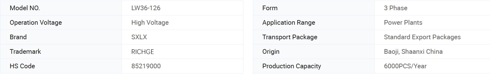 Тип LW-126 типу на відкритому повітрі високої напруги, що змінюють струм гексафторидного вимикача сірчаної сірки (далі, називають вимикачем)-це своєрідний обладнання для високостільних пристроїв на відкритому повітрі з трьома полюсами AC Sohzand, який він приймає газу SF6 як витримка дуги та ізоляційне середовище. Він може бути використаний для розділення та комбінації номінального струму та струму несправності, банку конденсатора та перемикання ланцюга, а також може бути використаний як вимикач, що роз'єднує, щоб реалізувати керування та захист ліній передачі та обладнання, особливо придатного для частого операції.
