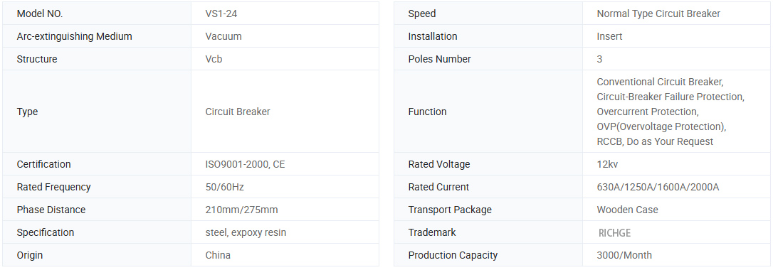 Серія VS1-24 у вакуумному вимикачі високої напруги в приміщенні із загальним утепленим циліндром-три-фраза A.C. 50 Гц в приміщенні обладнання для розподілу живлення з номінальною напругою 24 кВ. Він використовується для захисту контролю електричного обладнання в галузях промисловості та гірничих підприємств, електростанцій та підстанцій. Цей тип вакуумного вимикача відповідає національним стандартам та умовою стандарту IEC, можливості досягають ступеня M2-E2-C2.