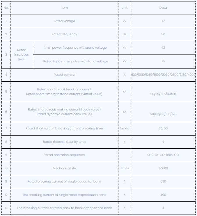 Технічні параметри VSG-12 1600A VCB Фіксований тип твердого полюса